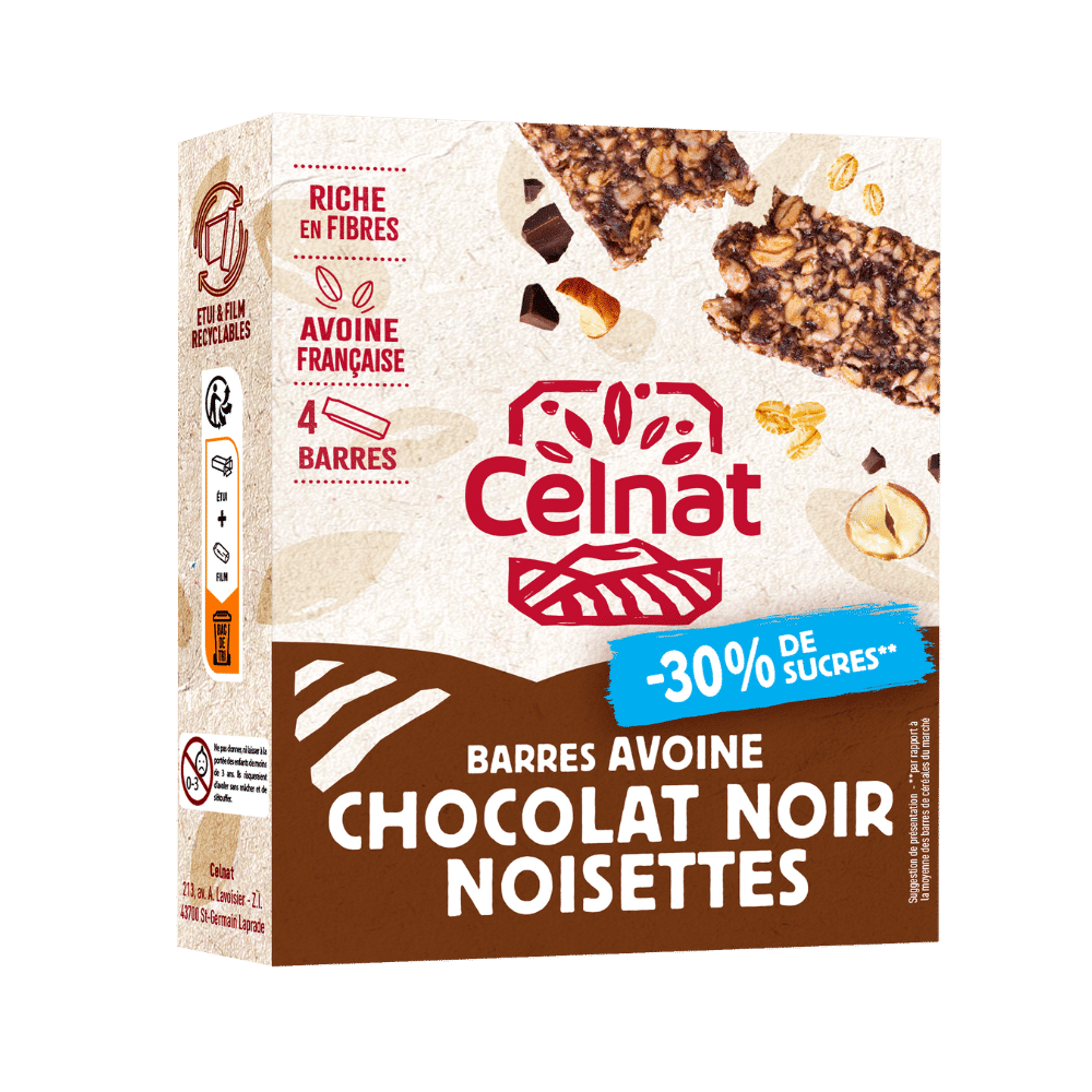 Avec des flocons d‘avoine française, fabriqués dans notre moulin en Auvergne. Des pépites de chocolat noir pour le côté gourmand et des noisettes pour le croquant.