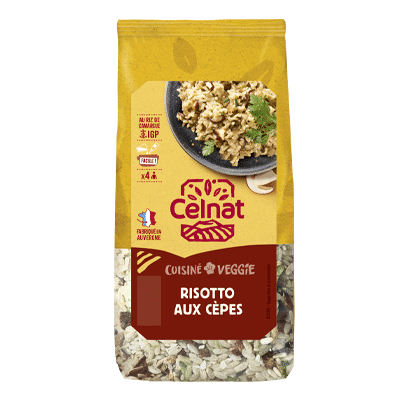 Riz de Camargue IGP long demi-complet* (91,2%), cèpes* (4%), oignon*, ail*, poireau*, ciboulette*. (*)issu l’agriculture biologique.