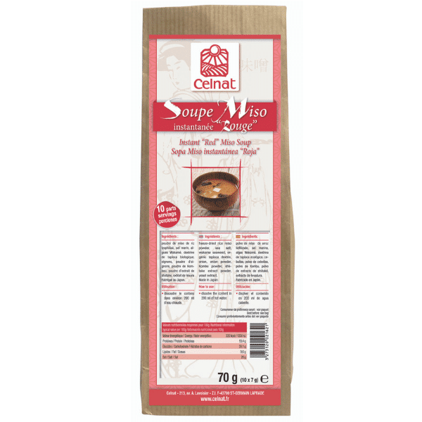 La soupe miso instantanée rouge se compose de miso de riz complet, d’algues, de poudre de Shiitakés, d’oignons et d’amidon pour apporter de la texture. Le miso de riz complet possède les avantages du riz complet et contient donc la majeure partie des éléments nutritifs de cette céréale. Cette soupe préparée instantanément vous garantit un mets savoureux et nutritif.